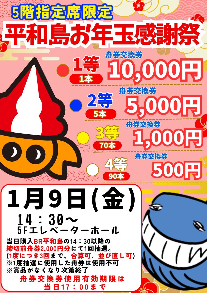 1/9(金)5F指定席限定 舟券交換券が当たるBR平和島お年玉感謝祭!