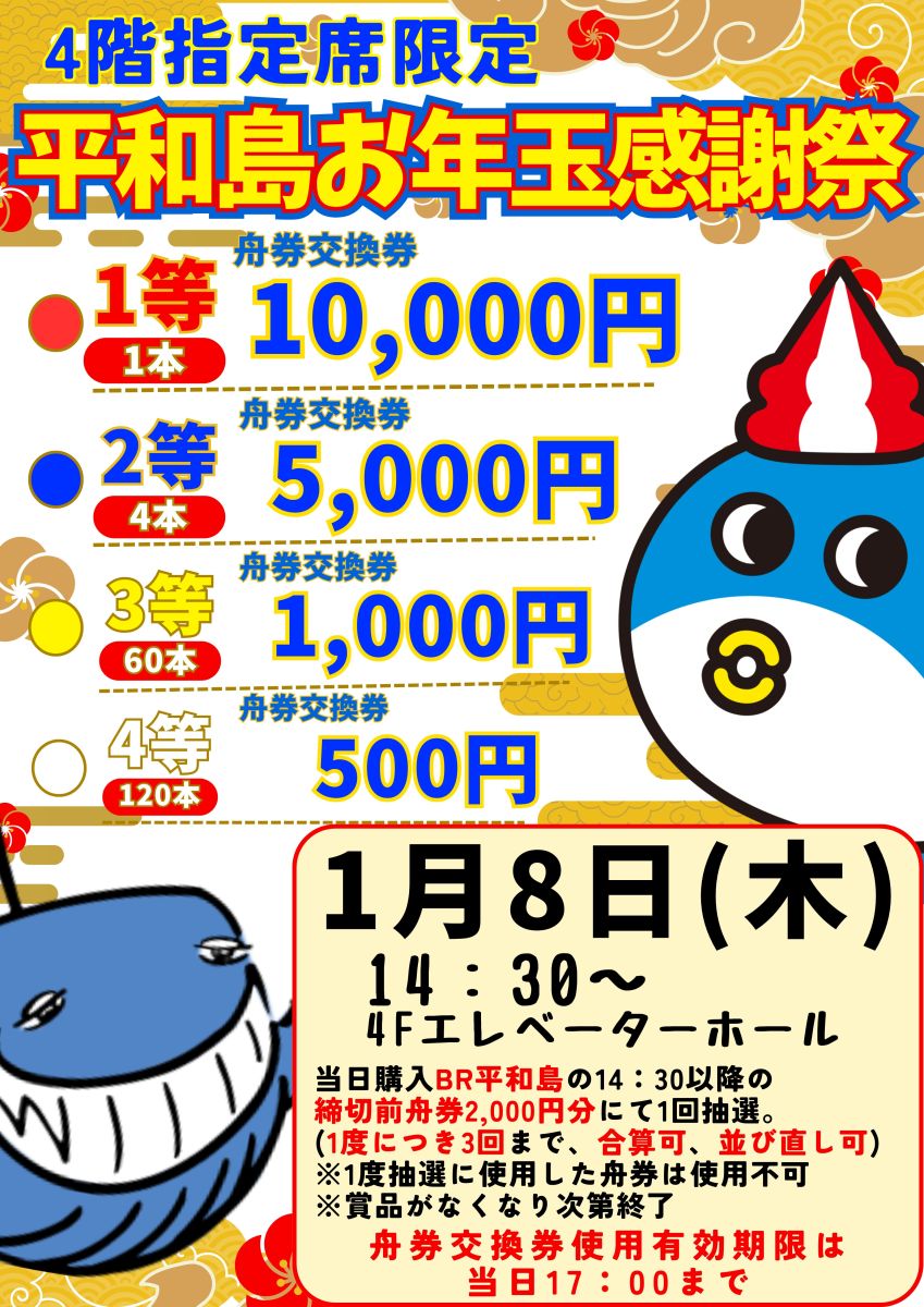 1/8(木)4F指定席限定 舟券交換券が当たるBR平和島お年玉感謝祭!