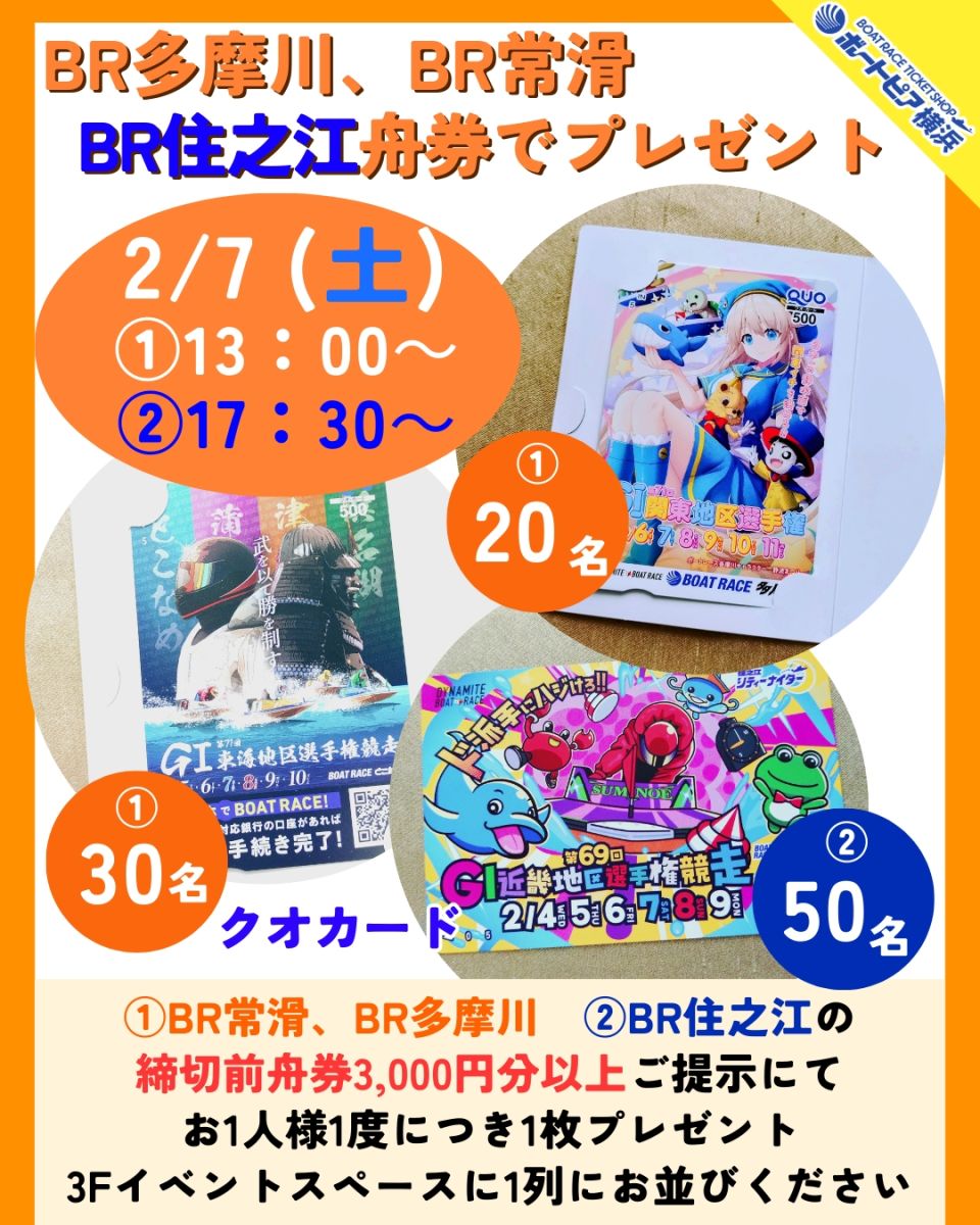 2/7BR多摩川、BR常滑、BR住之江の締切前舟券でクオカプレゼント!